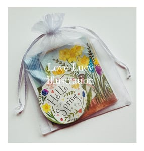 In this special little Spring Pack you’ll find 8 mini prints, a wooden decoration and a fridge magnet, all presented in a pretty organza pouch.